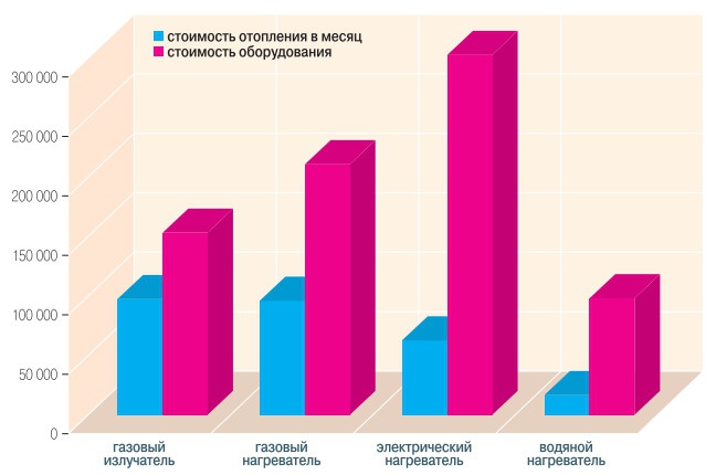 Принимая среднемесячное потребление тепла в отопительном периоде на уровне 26 тыс. кВт•ч, можно рассчитать стоимости отопления помещения различными способами. Газовые излучатели потребуют 86,5 тыс. руб., газовые нагреватели — на 392 руб. больше. Электронагреватели потребуют в месяц 56,2 тыс. руб. Водяные нагреватели — 22,9 тыс. руб. плюс стоимость электроэнергии для вращения вентиляторов на 4-й скорости — 392 руб.