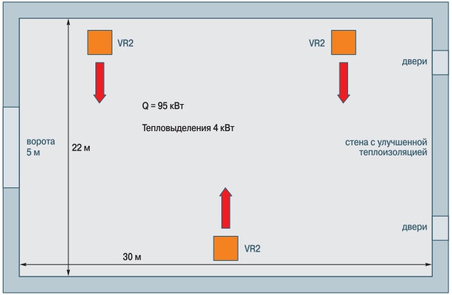 Для отопления данного цеха можно использовать пять аппаратов Volcano VR1, каждый из которых на 4-й скорости вентилятора имеет тепловую мощность 17,9 кВт. Или три аппарата Volcano VR2, имеющих тепловую мощность по 29,8 кВт на 4-й скорости. В этом случае стоимость оборудования с автоматикой составит около 107 276 руб., а стоимость котла на угле — около 74 627 руб. Так как обслуживание оборудования не требует персонала, то стоимость эксплуатации и осмотров стремится к нулю.