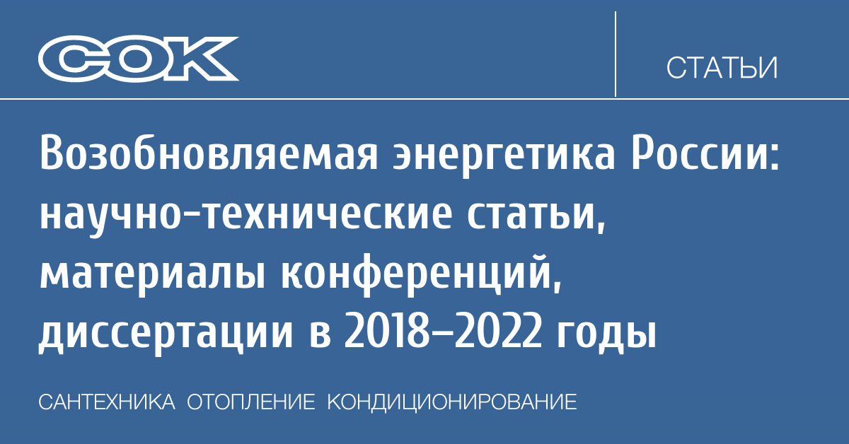 По общему числу опубликованных статей (117) лидирует журнал СОК («Сантехника. Отопление. Кондиционирование. Энергосбережение. Возобновляемая энергетика»), из них большинство — краткие сообщения о результатах использования ВИЭ. По научной специальности 05.14.08 по перечню ВАК РФ было опубликовано 47 рецензированных статей. Основная тематика статей журнала: комплексы ВИЭ, солнечная и ветровая энергетика. В архиве журнала поиском доступны статьи, как по отдельным темам, так и по авторам. Журнал СОК информирует читателей о соответствующих выставках, конференциях и книгах по ВЭ.