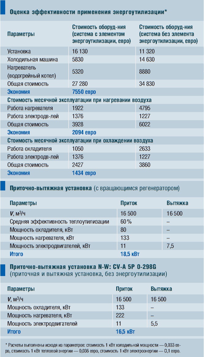 Приведенные в таблицах спецификации доказывают, что установки с энергоутилизацией позволяют снизить мощность нагревателя на 89 кВт и холодильного агрегата на 53 кВт. Несмотря на то, что общая мощность двигателей в установке с энергоутилизацией на 2 кВт больше, холодильный элемент блока энергоутилизации сокращает общее потребление электроэнергии установки на 17 кВт, что в целом означает экономию мощности всей системы — 15 кВт.