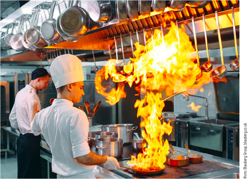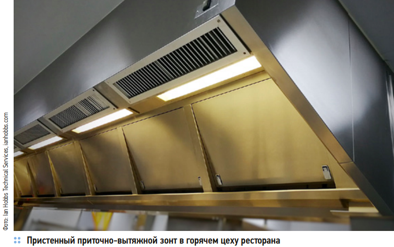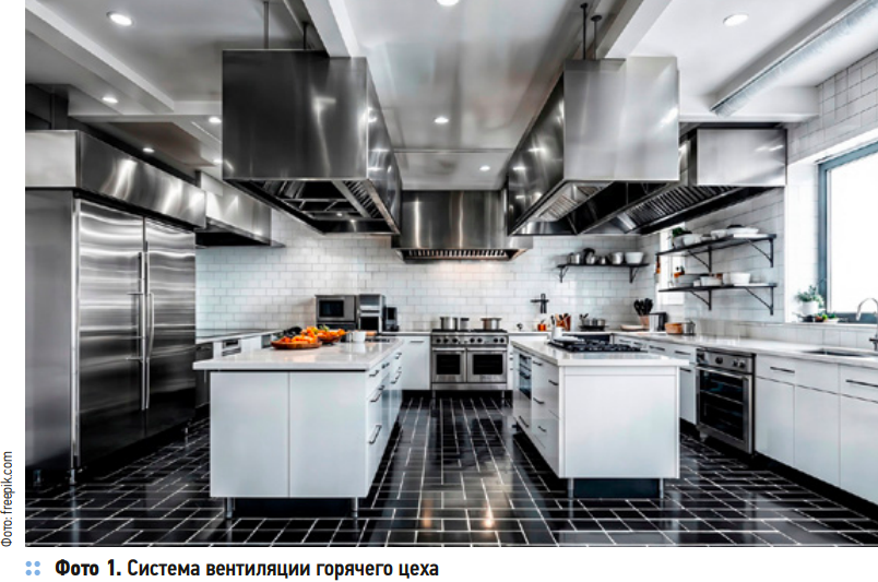 Горячий цех ресторана — центральный производственный участок кухни, где происходит термическая обработка продуктов (варка, жарка, запекание, тушение) и завершается приготовление большинства основных блюд, супов, соусов и гарниров. Системы вентиляции горячего цеха (фото 1) должны одновременно убирать тепло, пар, жир, запахи и при этом не задувать поварам в лицо. Особую роль при этом играют местные вытяжные зонты, которые располагаются непосредственно над кухонным тепловыделяющим оборудованием, то есть плитами, фритюрницами, пароконвектоматами и т. д.