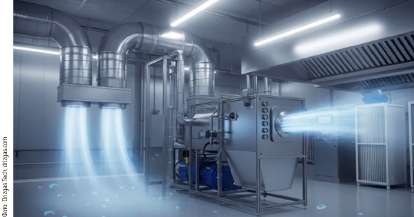Существуют также водяные системы, которые получили название «мокрые скрубберы» (wet scrubber/wet PCU). Они ставятся после вытяжного зонта в канале, представляя собой отдельный блок очистки. Внутри устройства форсунки распыляют воду (иногда с реагентом), поток воздуха проходит через каскад сеток/лабиринтов, где жир, сажа, искры и часть запахов переходят в воду, далее каплеуловитель отделяет туман (рис. 4).