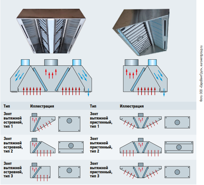 Рис.2. Островной (слева) и пристенный приточно-вытяжные зонты и их типы