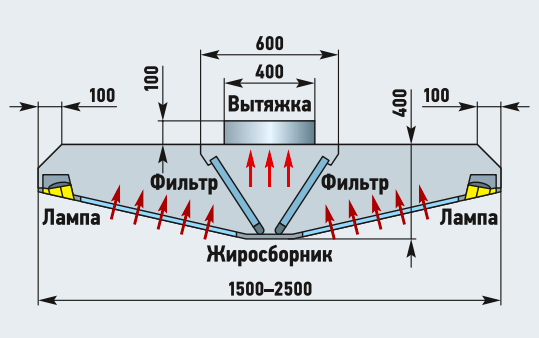 - расход вытяжки зонта определяется по формуле L = Av3600 [ м³/ч], где A — площадь плоскости всасывания [ м²], v — выбранная скорость потока [м/с];