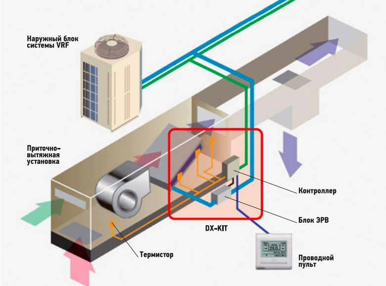 Поэтому единственное логичное решение — это охлаждение приточного вентиляционного воздуха встроенным компрессорно-конденсаторным блоком (ККБ). Сегодня оптимально применение инверторного наружного блока VRF в качестве ККБ (рис. 3).
