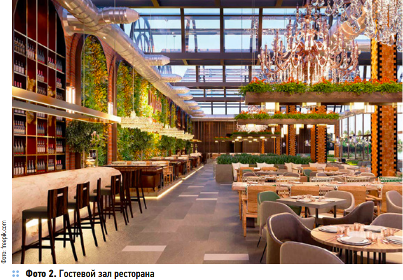 Системы вентиляции и кондиционирования гостевых залов в большей степени направлены на поддержание комфортных параметров микроклимата для находящихся там людей. Требование комфортной температуры для посетителей (обычно 22–24°C зимой и не выше 24–25°C летом). Высокая плотность людей (до 0,6–1,0 человека на 1 м² в пике) определяет существенный вклад внутренних тепловыделений. Поэтому основные теплоизбытки в помещениях гостевых залов происходят от находящихся там людей и от вентиляционного приточного воздуха, если он предварительно не охлаждается в приточных установках. Если в помещении горячего цеха должно поддерживаться небольшое превышение вытяжного воздуха над приточным, то в помещениях гостевого зала (фото 2), наоборот, количество приточного воздуха должно быть больше, чем количество вытяжного. Это обеспечивает отсутствие проникновения кухонных запахов, дыма и избыточной влажности в зал. Также не нужно забывать о таком важном составляющем комфорта, как уровень шума.