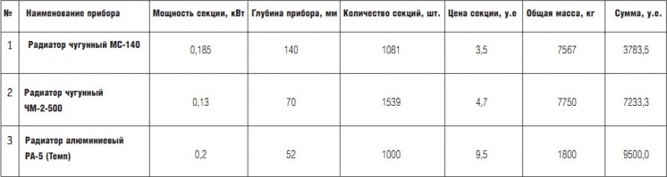 Для удобства сравнения номинальный тепловой поток примем 200 кВт (примерно 10-ти этажный одноподъездный дом площадью 3000 кв. м). Стоимость секции радиаторов приведена с учетом их перегруппировки, опрессовки и комплектации кронштейнами.