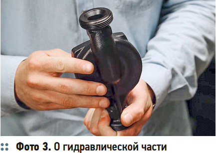 Гидравлическая часть. Конструкция отличается от привычной прямолинейной формы, характерной для базовых моделей (фото 3). Оптимизированная геометрия снижает гидравлические потери и тем самым повышает энергоэффективность. По данным сравнительных испытаний, на каждой из трёх скоростей насос потребляет примерно на 30% меньше электроэнергии, чем ряд аналогов, и это серьёзное преимущество при эксплуатации.
