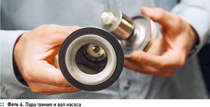 Пара трения и вал. В насосе используется пара «керамика — керамика»: и вал, и упорный подшипник выполнены из керамики (фото 4). Это важно, потому что керамические элементы не подвержены намагничиванию, устойчивы к агрессивным средам и механическим примесям в теплоносителе (песок, накипь и т. д.). В отличие от стальных валов, склонных к накоплению металлических частиц и возникновению «клина», керамика обеспечивает более стабильную работу.