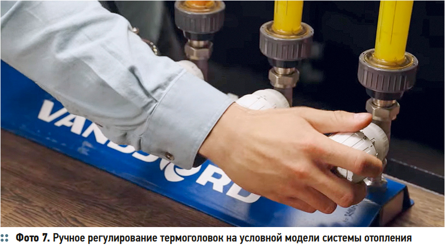 Если же в системе стоят термостатические головки, ситуация меняется. При их частичном закрытии (фото 7) расход теплоносителя через радиаторы уменьшается, и температура в комнатах становится комфортнее. Но односкоростной насос при этом продолжает вращаться с прежней частотой, поэтому общее энергопотребление снижается лишь незначительно — с 39 до 27 Вт.