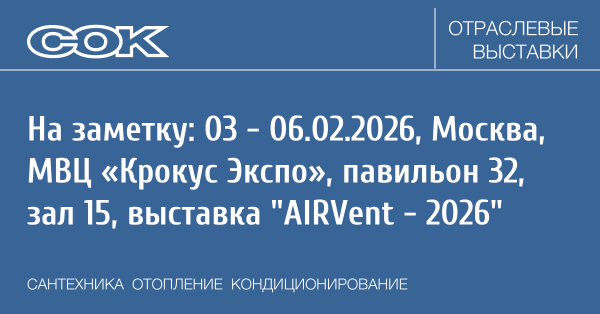 - устанавливать персональные «живые» бизнес-контакты на международной выставке оборудования, технологий и услуг для вентиляции, кондиционирования и холодоснабжения бытовых, коммерческих и промышленных объектов AIRVent с 3 по 6 февраля 2026 года