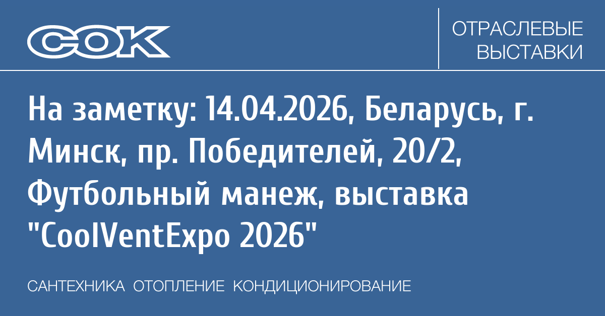 Выставка CoolVentExpo пройдет одновременно с выставкой Вода&Тепло, крупнейшим отраслевым мероприятием Республики Беларусь, объединяющим поставщиков и производителей технологий и оборудования для качественного водои теплоснабжения.