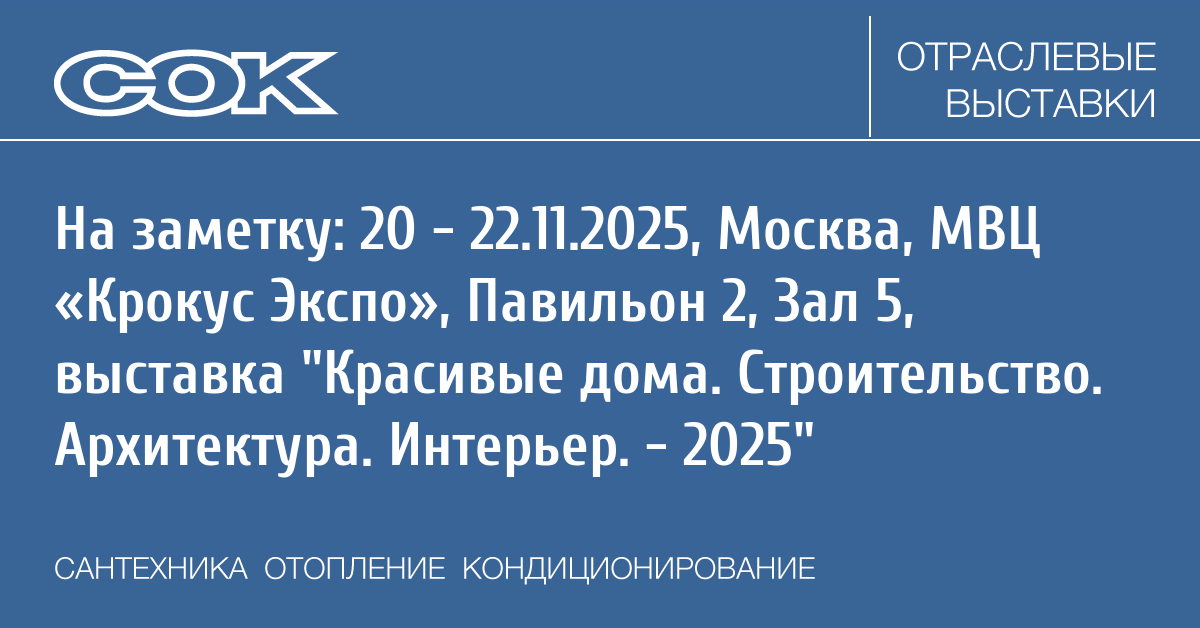 - Место: архитектурно-строительная и интерьерная выставка «Красивые дома» в МВЦ «Крокус Экспо», г. Москва