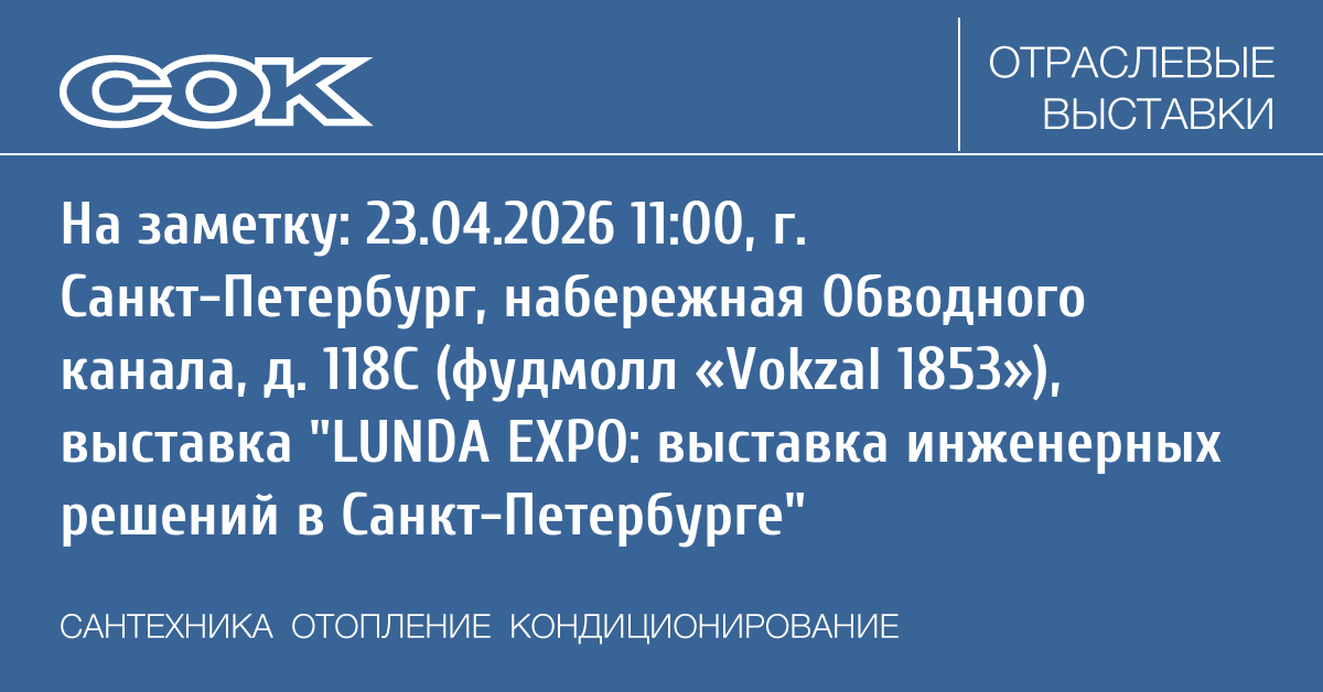 Выставка инженерных решений LUNDA EXPO (ЛУНДА ЭКСПО) пройдет в Санкт-Петербурге 23 апреля 2026 года совместно с производителями Termoclip, Mr. Bond, Tecofi, Tatpolimer, Броен, Oventrop, EKF, Zota, Arrowhead, Gidruss, Zont, Эван, LD, SFA, Теплолюкс, Neptun, Isoterm, VitrA, Huch EnTEC, Rommer, Stout, Ридан, Gala, ADL, Navien, Vandjord, Shinhoo, Usystems, Sanha / Зана, VIRPlast, Wirquin, Конкреп, Ostendorf, Фламко, Astrex, Gidrolock, Rothenberger, Voll, IMP Pumps, MVI, Giacomini, Рехау, KZTO Radiator, K-Flex, Rols Isomarket, Protherm, Vaillant, Wilo, Native, Krats, KERAMA MARAZZI, Сантехмастер Групп, Pro Aqua.