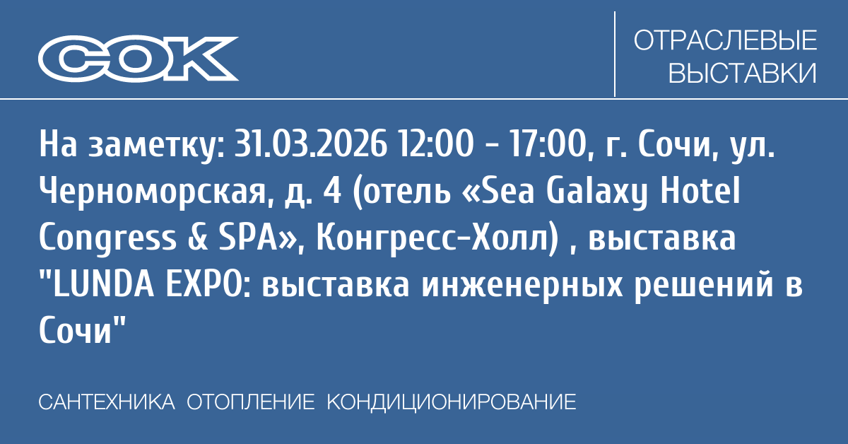 Выставка инженерных решений LUNDA EXPO (ЛУНДА ЭКСПО) пройдет в Сочи 31 марта 2026 года совместно с производителями Isoterm, Рустеплопол, Rommer, Stout, Veda, Navien, Oventrop, Vandjord, Shinhoo, Usystems, CNP, Immergas, Конкреп, Kiturami, Ostendorf, Фламко, Astrex, Gidrolock, Rothenberger, Voll, Рехау, Теплолюкс, Neptun, KZTO Radiator, K-Flex, Wilo, Native, VIRPlast, Wirquin, Зана, ADL.