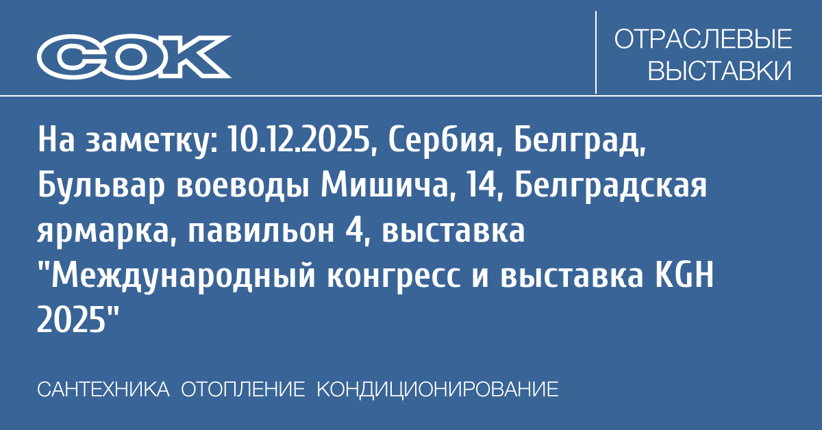 Международный конгресс и выставка KGH - это регулярная ежегодная встреча, имеющая давнюю традицию объединения экспертов, инженеров, исследователей, производителей оборудования и других специалистов из Республики Сербии и мира, которые занимаются энергетическими системами в зданиях, городах и промышленности, и, прежде всего, в секторе отопления, охлаждения и кондиционирования воздуха.
