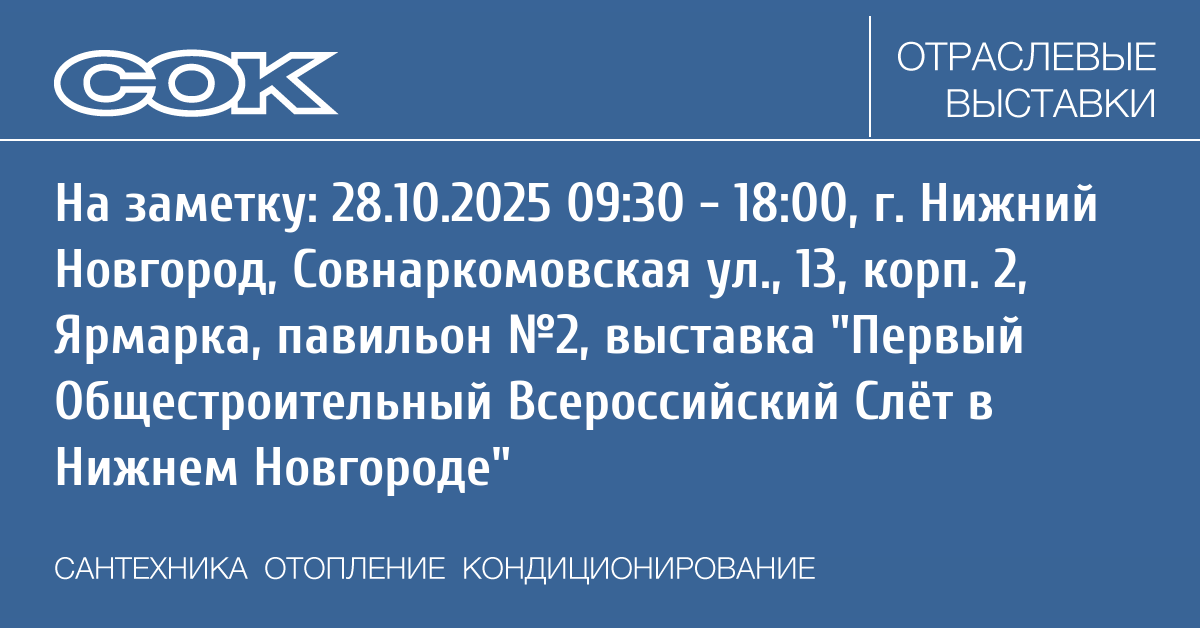 Первый Общестроительный Слёт в Нижнем Новгороде — это уникальный формат В2В встреч для мастеров и строителей. На одной площадке соберутся производители и специалисты в сфере ремонтно-отделочных работ, монтажники инженерных систем, проектировщики, дизайнеры среди которых профессионалы и начинающие мастера из разных регионов России. В программе Слета конкурсы и мастер-классы от популярных блогеров-мастеров, конкурс на целый день для каждого из посетителей.