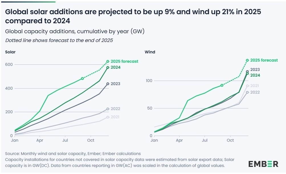 Мощности ВИЭ, по прогнозу Ember, в 2025 году должны вырасти на 793 ГВт, что на 11% больше, чем 717 ГВт в 2024 году. Темпы роста, конечно, замедляются, в 2023 году они составляли 22%, а в 2022 году 66%, но объемы уже таковы, что ожидать поддержания высоких темпов роста наивно.