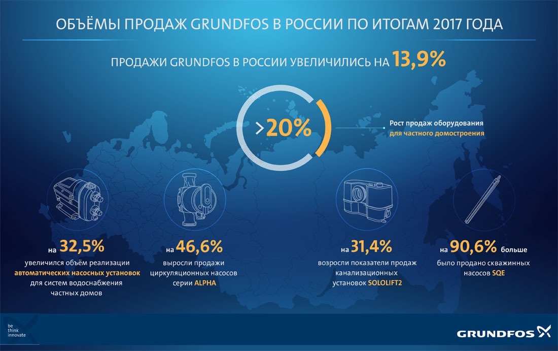 По итогам 2017 года продажи GRUNDFOS в России увеличились на 13,9%, а общемировой объём производства составил 17 миллионов единиц продукции. Как отмечают в компании, на отечественном рынке основной рост пришёлся на долю "умного" энергоэффективного оборудования для частного домостроения. Это говорит об увеличении сегмента индивидуальной застройки и формировании устойчивого спроса частных домохозяйств на энергосберегающие и автоматизированные решения.