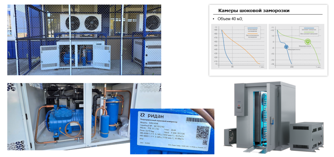 Камеры шоковой заморозки работают в экстремальном температурном диапазоне от +90⁰С до −25⁰С. Для стабильной работы в таких условиях требуется надежный компрессор, способный выдерживать нагрузки на всех этапах термообработки, обеспечивая равномерное поддержание температуры и высокую скорость кристаллизации продукта.