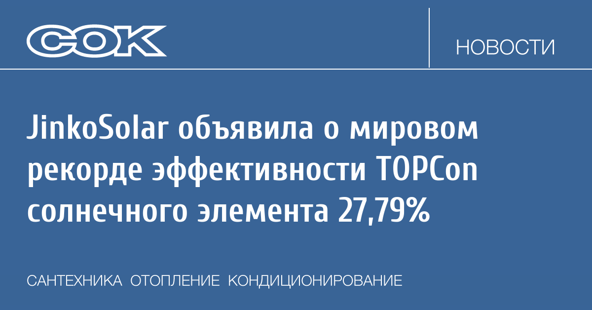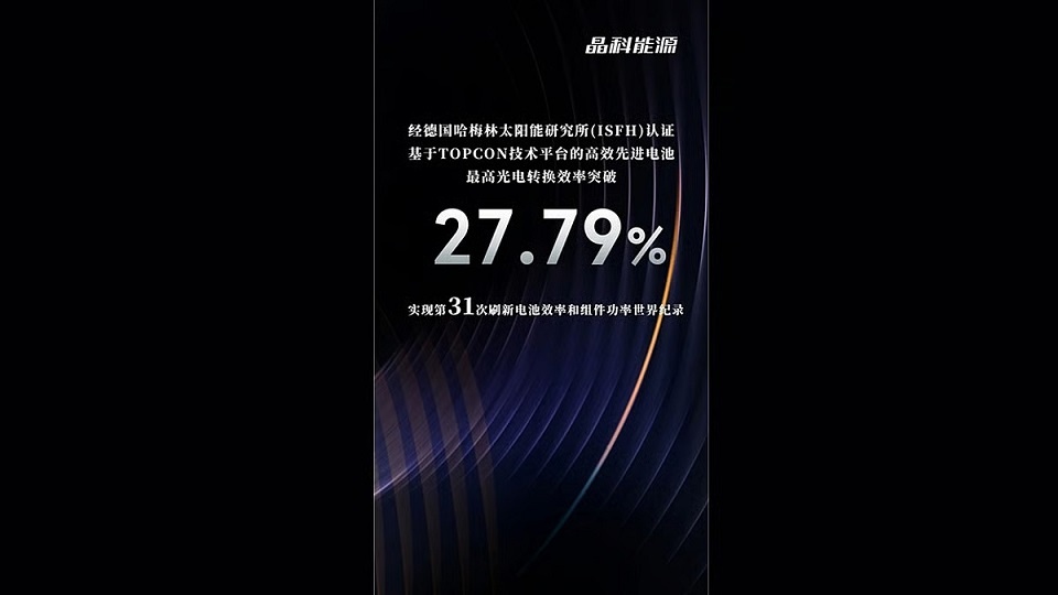 Китайская компания JinkoSolar, крупнейший в мире производитель солнечных панелей, объявила о достижении нового мирового рекорда эффективности фотоэлектрического элемента (ячейки) TOPCon в 27,79%.