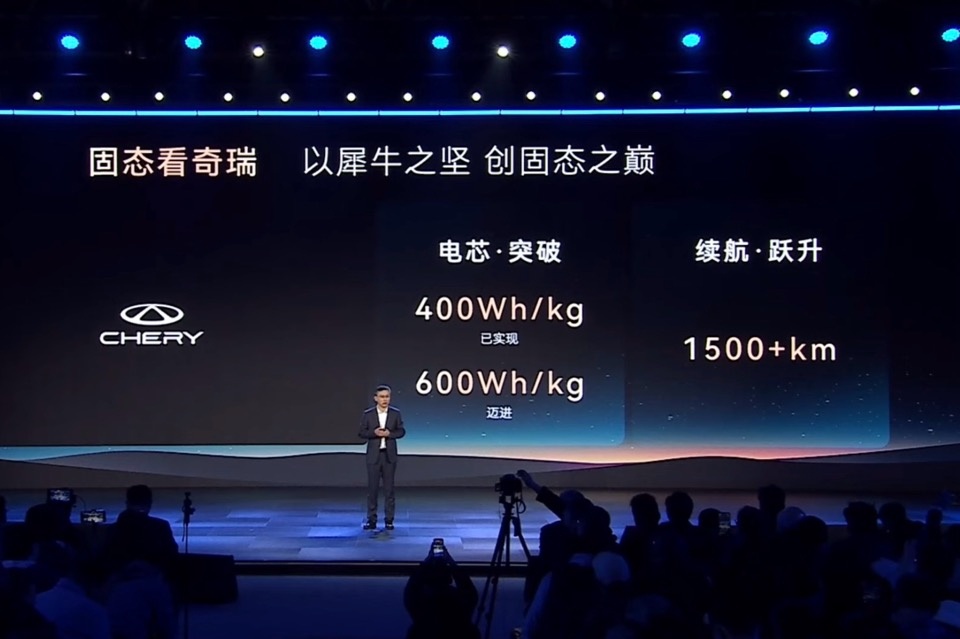 Chery заявила, что «достигла» прорыва в технологиях твердотельных аккумуляторов, добившись плотности энергии в 400 Вт*ч/кг и намереваясь достичь 600 Вт*ч/кг, что позволит обеспечить более 1500 километров пробега на одной зарядке.