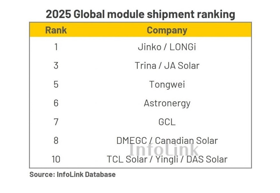Компания InfoLink опубликовала рейтинг крупнейших производителей (поставщиков) солнечных модулей в 2025 году.