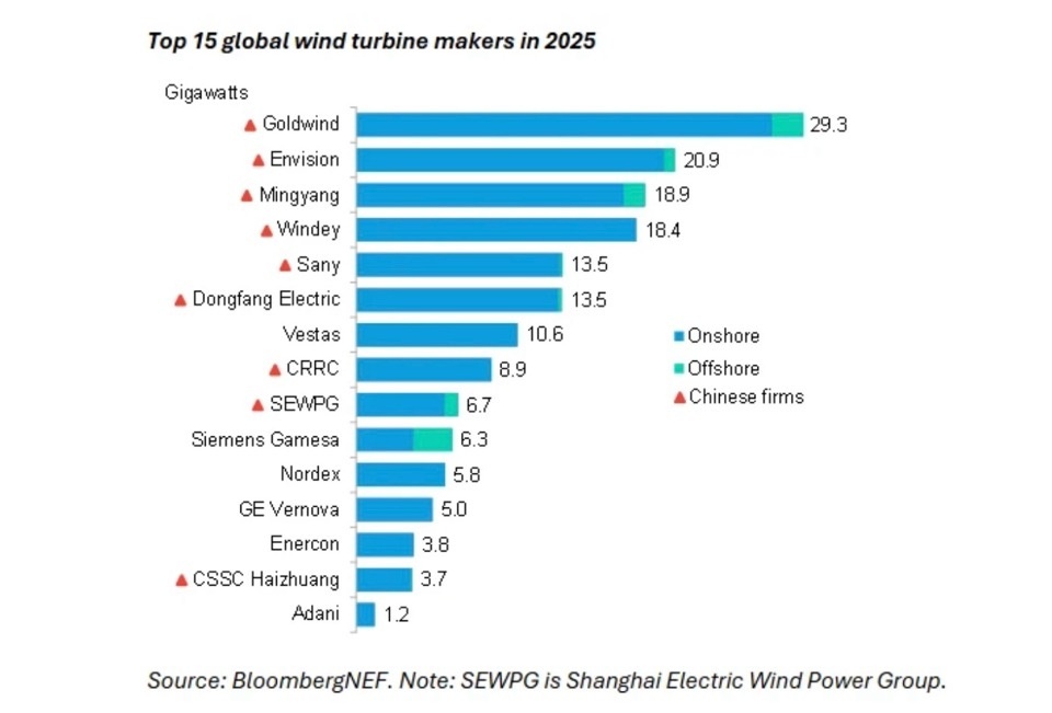 Китайская компания Goldwind сохранила свои позиции в качестве ведущего мирового поставщика ветряных турбин, установив 29,3 ГВт в 2025 г. Envision сохранила за собой второе место с 20,9 ГВт, почти четверть из которых была установлена за пределами материкового Китая. За ними следуют Mingyang и Windy, а Sany и Dongfang Electric замыкают шестерку крупнейших игроков, установив по 13,5 ГВт каждая.
