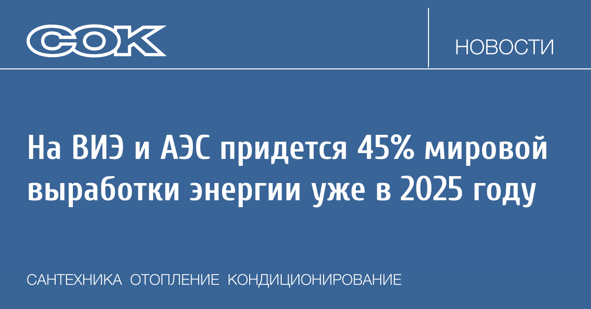 Международное энергетическое агентство в новом докладе прогнозирует, что в ближайшие несколько лет до 90% всей новой энергогенерации будет поступать из возобновляемых источников и АЭС. К 2025 году на возобновляемые источники будет приходиться 35% мирового производства электроэнергии. Доля угля, по прогнозам, упадет до 33%. В ядерной энергетике, которая условно считается чистой, также будет скромный подъём — на нее придется примерно 10% мировой генерации, в то время как газ сохранит около 20%. В итоге на ВИЭ и АЭС к 2025 году придется уже около 45% глобальной генерации энергии.