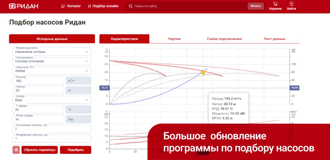 Конфигуратор насосного оборудования Pump Select (Памп Селект) — позволяет осуществить самостоятельный подбор насосов Ридан и получить расчетный лист с кодовым номером и необходимыми для проектирования и монтажа техническими данными.