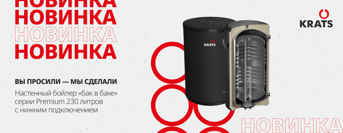 KRATS — российский производитель инженерного отопительного оборудования представил новинку в линейке бойлеров KRATS Premium: Настенный бойлер «бак в баке» 230 литров с нижним подключением.