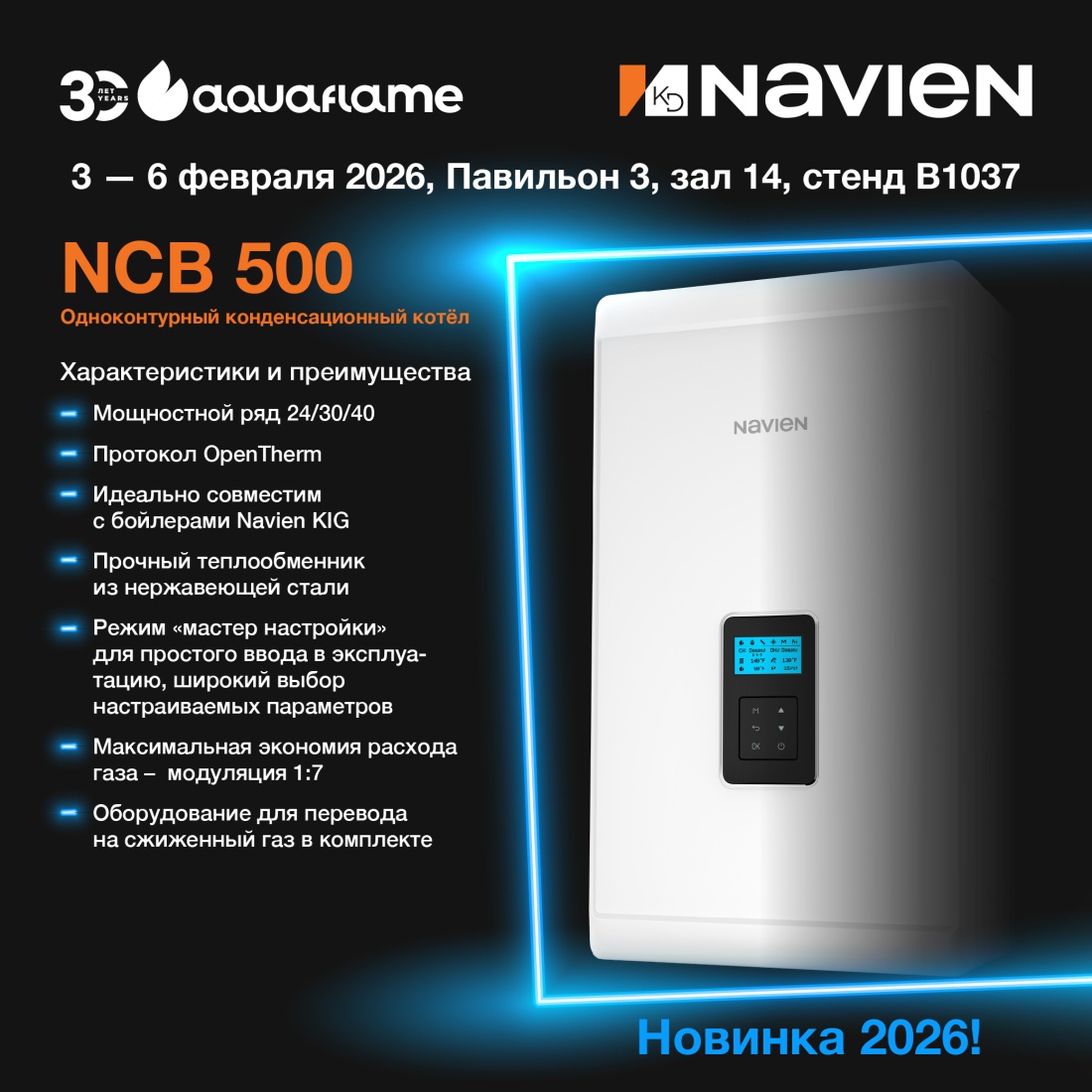 Многих специалистов и потребителей заинтересовал вопрос — что же нового представит Navien на своем стенде в честь юбилейной 30-й выставки Aquaflame Moscow 2026?