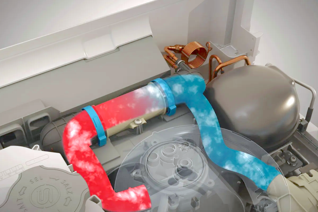 В отличие от традиционных моделей с конденсационной сушкой, здесь используется замкнутый термодинамический цикл: тепло не выбрасывается наружу, а повторно используется для мягкой и эффективной сушки посуды, что позволяет заметно снизить энергопотребление.