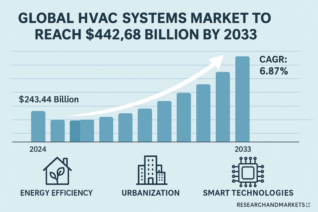 Мировой рынок систем кондиционирования воздуха, по прогнозам, вырастет с 243,44 млрд долларов США в 2024 году до 442,68 млрд долларов США к 2033 году при совокупном годовом темпе роста (CAGR) в 6,87%, согласно новому отчету ResearchAndMarkets. Этот рост обусловлен растущей урбанизацией, растущим спросом на энергоэффективные технологии климат-контроля, достижениями в области интеллектуальных систем и расширением строительных работ в жилом, коммерческом и промышленном секторах.