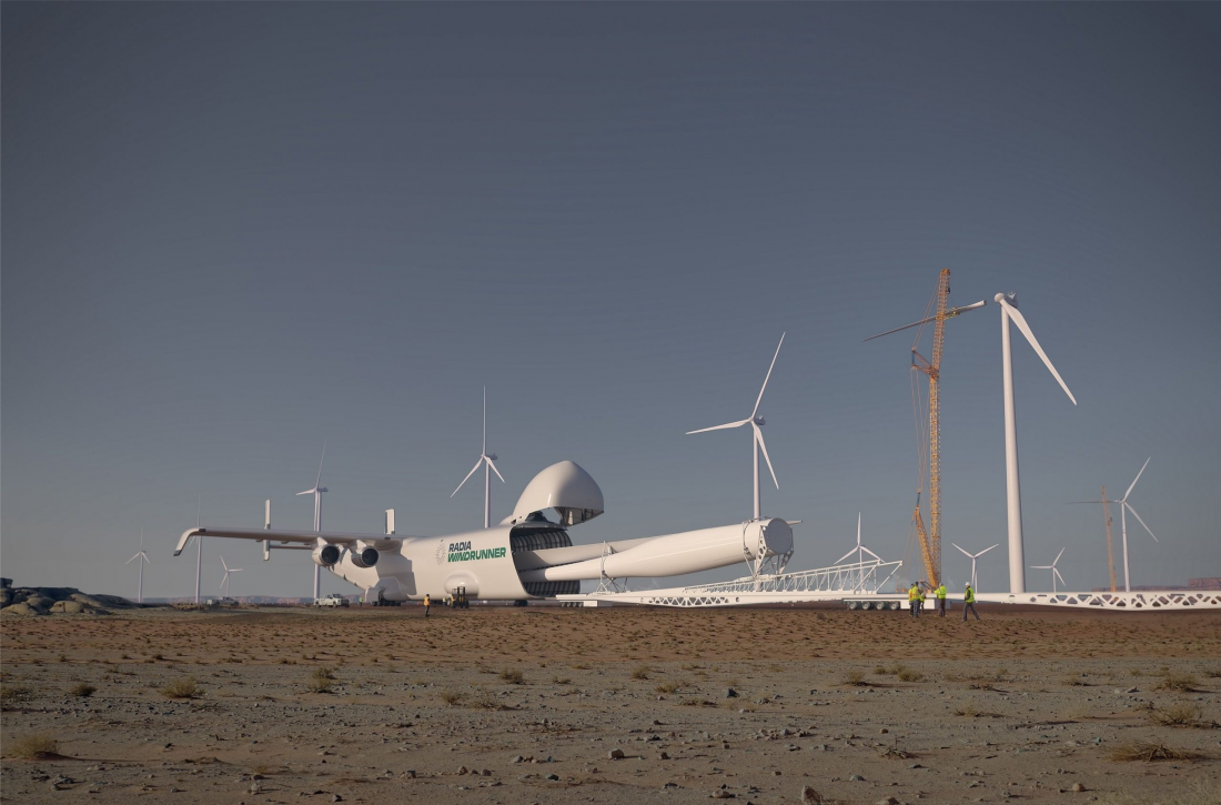 Искусство поражать воображение потенциальных инвесторов достигло небывалых высот. Стартап Radia (Боулдер, штат Колорадо), созданный американским авиаинженером, готов спроектировать и построить крупнейший грузовой самолёт WindRunner длиной свыше ста метров для транспортировки лопастей ветровых турбин. Компания обещает, что такой самолёт сможет садиться и взлетать с земляной полосы длиной 1800 метров, расчищенной на месте строящегося ветропарка.