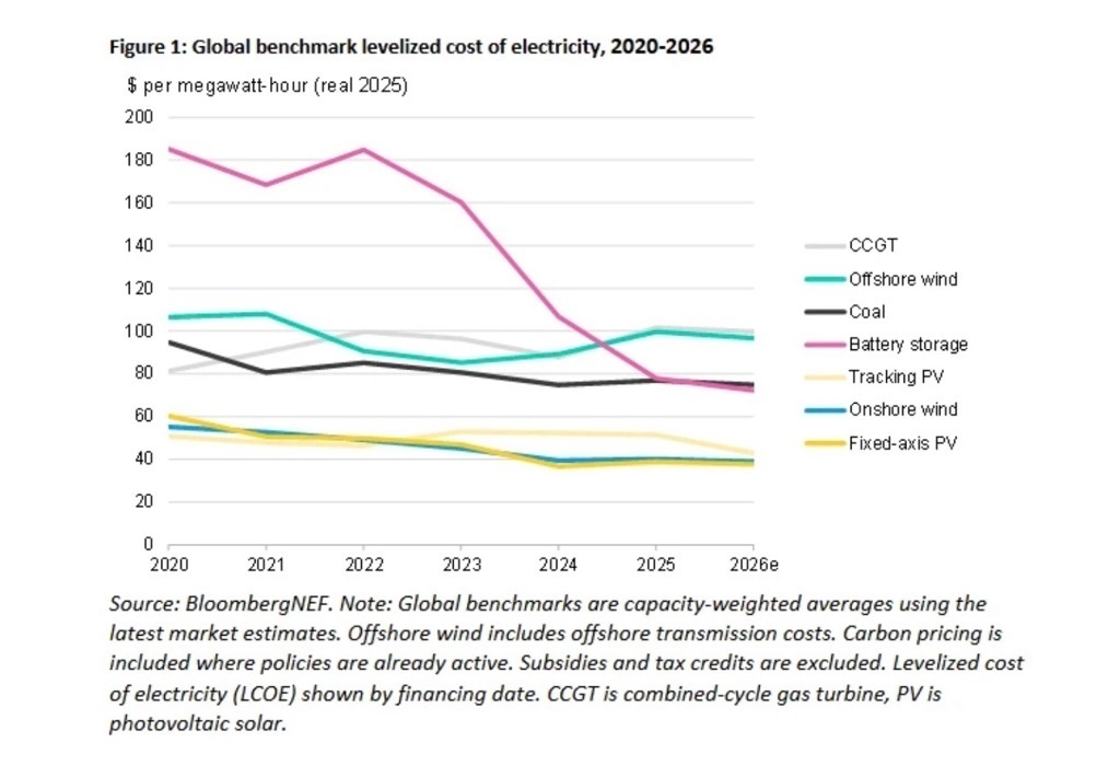 Исследовательская компания BloombergNEF (BNEF) опубликовала новый отчет с мировыми эталонами (бенчмарками) приведенной стоимости электроэнергии (LCOE) разных технологий Levelized Cost of Electricity 2026.