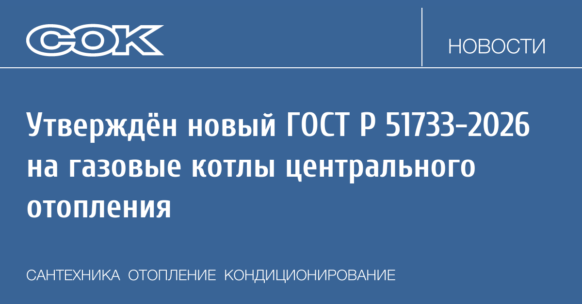 Росстандарт утвердил обновлённый национальный стандарт ГОСТ Р 51733–2026 «Котлы газовые центрального отопления, оснащённые атмосферными горелками номинальной тепловой мощностью до 70 кВт». Стандарт заменяет версию 2001 года и устанавливает обновлённые требования безопасности и методы испытаний.