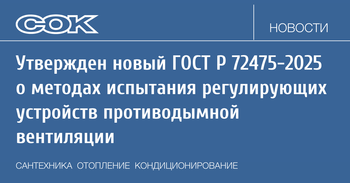 Принят и утвержден ГОСТ Р 72475–2025 «Оборудование противодымной защиты зданий и сооружений. Устройства регулирования параметров систем противодымной вентиляции. Метод испытаний на огнестойкость».