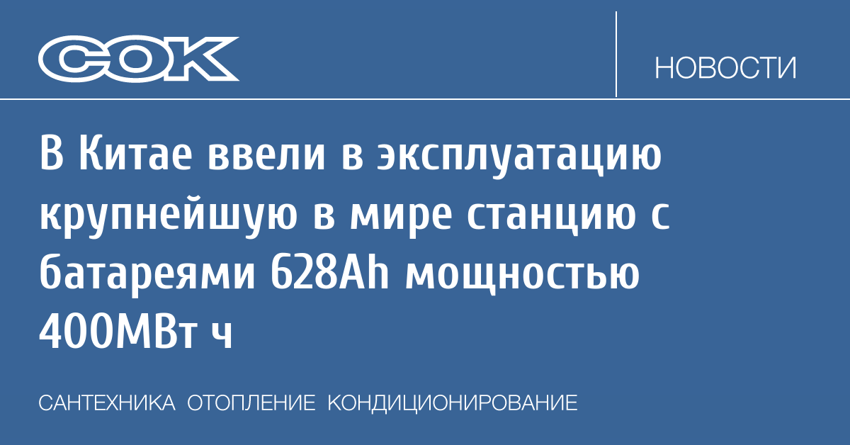 В Китае запустили первую в мире энергонакопительную станцию мощностью 400 МВт⋅ч с батареями емкостью 628 А⋅ч. Станция укрепит электросеть страны и обеспечит стабильное электроснабжение, сообщила компания EVE Energy.