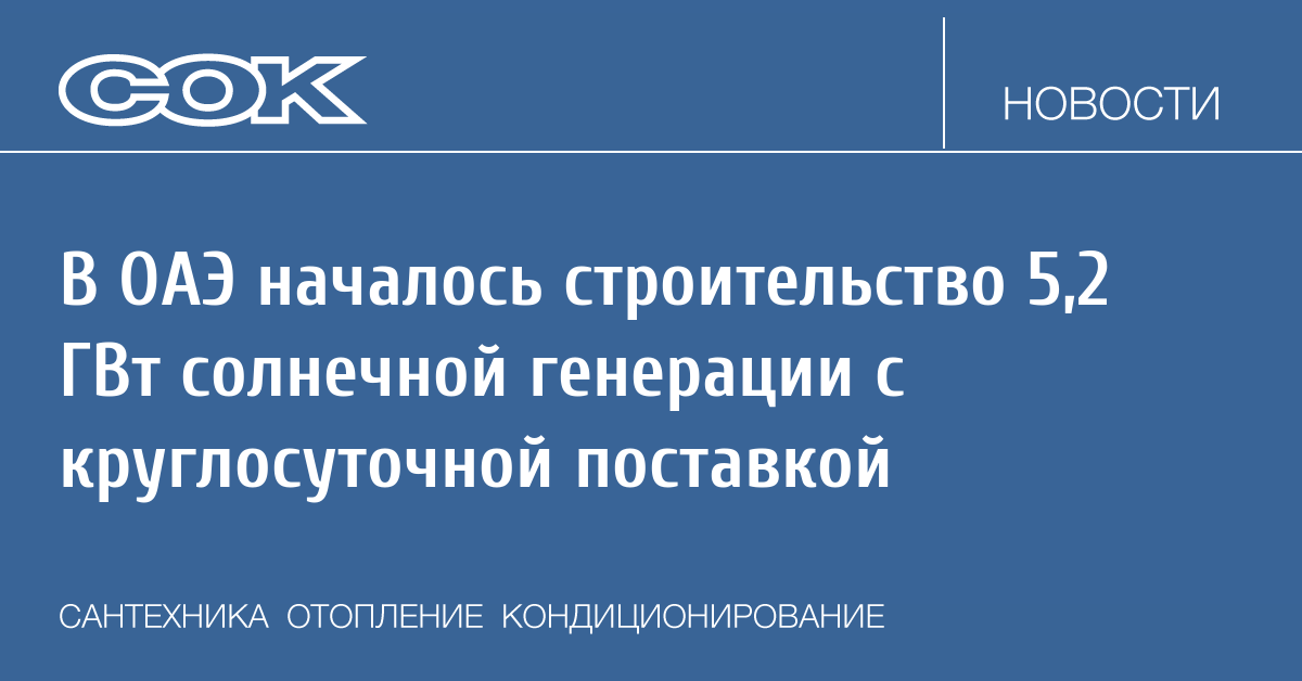 В Объединенных Арабских Эмиратах (ОАЭ) состоялась церемония начала строительства объекта солнечной энергетики, который будет обеспечивать круглосуточные поставки электроэнергии и мощности с помощью гигантских систем накопления энергии (литий-ионные аккумуляторы) ёмкостью 19 ГВт*ч.