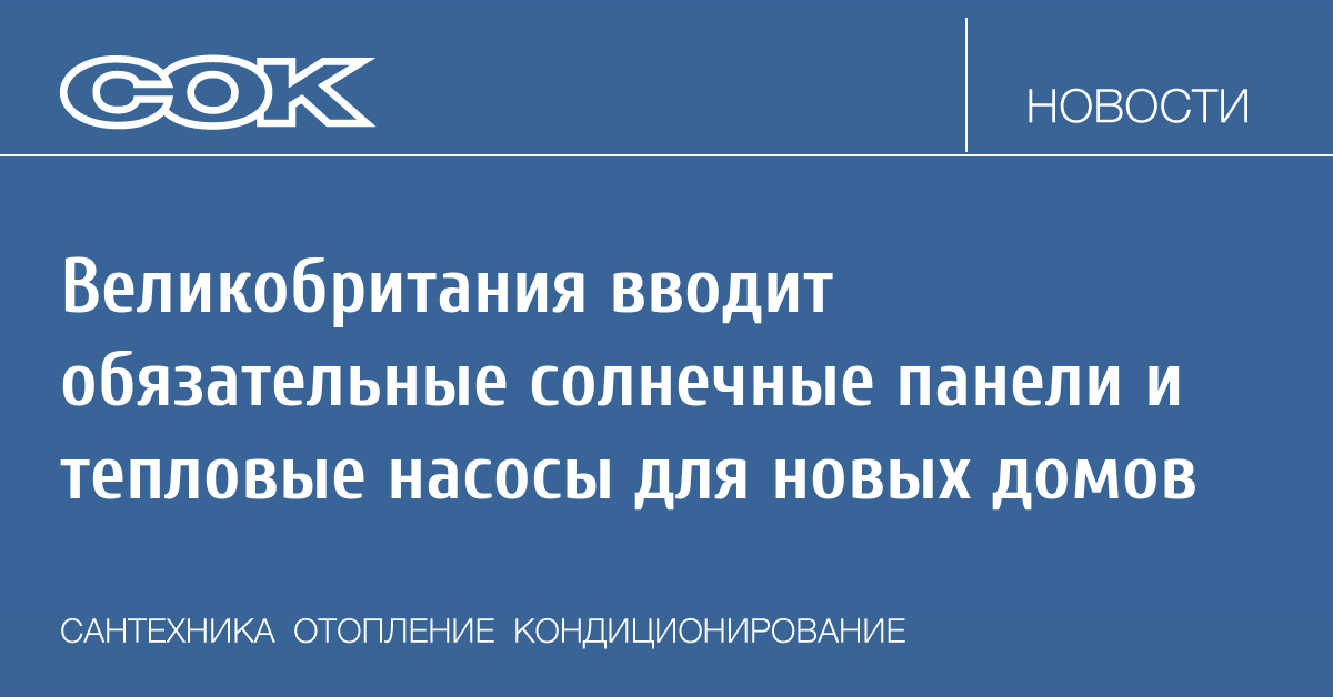 Правительство Великобритании объявило о планируемом ужесточении требований к новому жилищному строительству: в соответствии с обновлёнными нормами все новые дома в Англии должны будут оснащаться солнечными панелями и низкоуглеродными системами отопления, включая тепловые насосы.