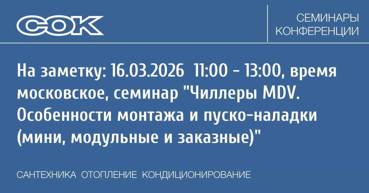 Семинар пройдёт в два этапа и охватит ключевые аспекты работы с чиллерами MDV разных типов. В первой части участники узнают о специфике монтажа и наладки минии модульных чиллеров: требования к размещению, подключению гидравлической обвязки, настройке автоматики и запуску системы. Во второй части будет рассмотрена работа с заказными (кастомными) чиллерами — от особенностей проектирования и комплектации под задачи заказчика до нюансов монтажа, интеграции в инженерные системы и проведения комплексной пусконаладки. Семинар поможет избежать ошибок на всех этапах внедрения оборудования и обеспечить его стабильную и энергоэффективную эксплуатацию.