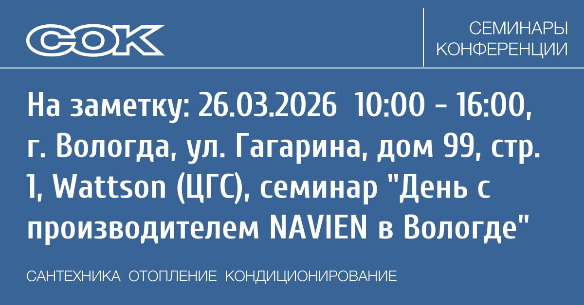 День с производителем NAVIEN пройдет 26 марта с 9:00 до 16:00 в г. Вологда для монтажных и сервисных специалистов.