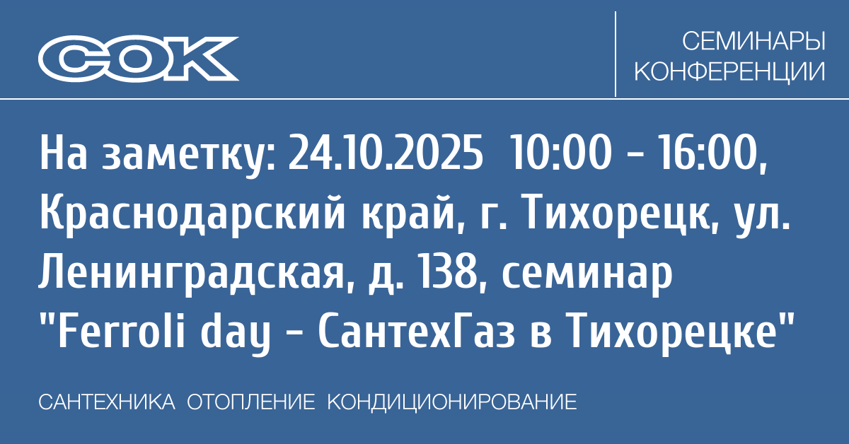 - 24.10.2025 10:00 - 16:00 Seminar Ferroli day - СантехГаз в Краснодаре