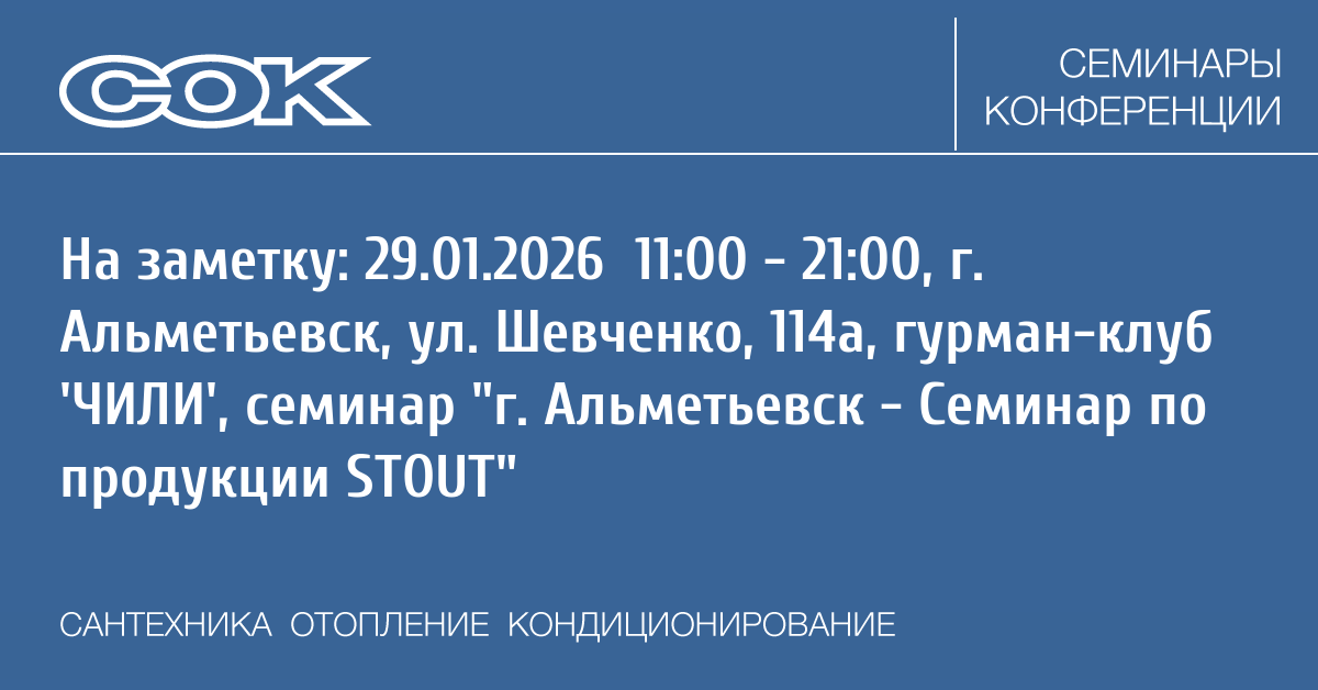 - 11:00–13:00 — Семинар STOUT. Гарантия, качество, новинки 2025 г.