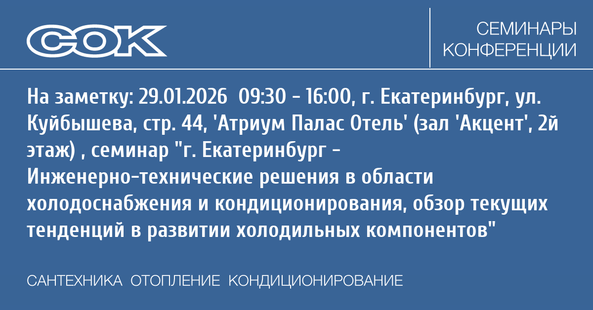 Семинар: г. Екатеринбург - Инженерно-технические решения в области холодоснабжения и кондиционирования, обзор текущих тенденций в развитии холодильных компонентов