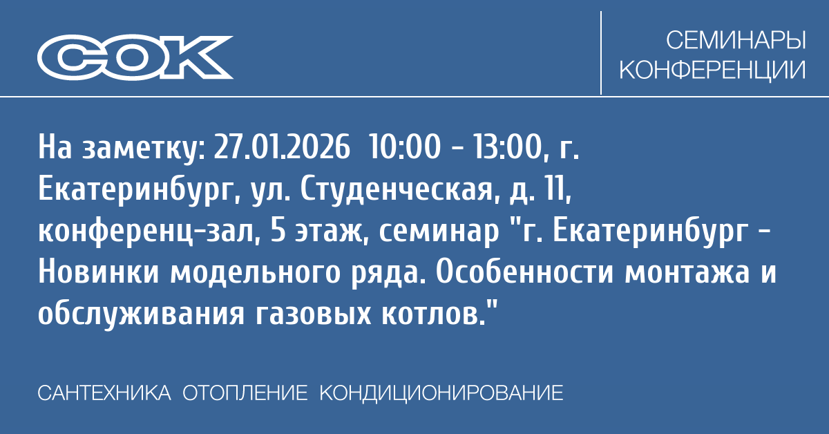 - 27.01.2026 10:00 - 13:00 Семинар г. Екатеринбург - Новинки модельного ряда. Особенности монтажа и обслуживания газовых котлов.