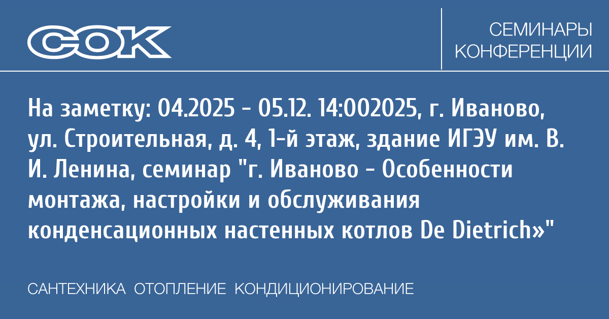 - 04.2025 - 05.12. 14:002025 Seminar г. Иваново - Особенности монтажа, настройки и обслуживания конденсационных настенных котлов De Dietrich»