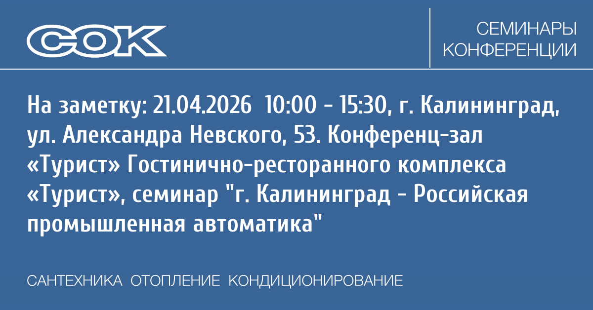 21 апреля 2026 года компания ОВЕН совместно с дилером ТЕХПРИБОР проведет в Калининграде семинар »Российская промышленная автоматика».