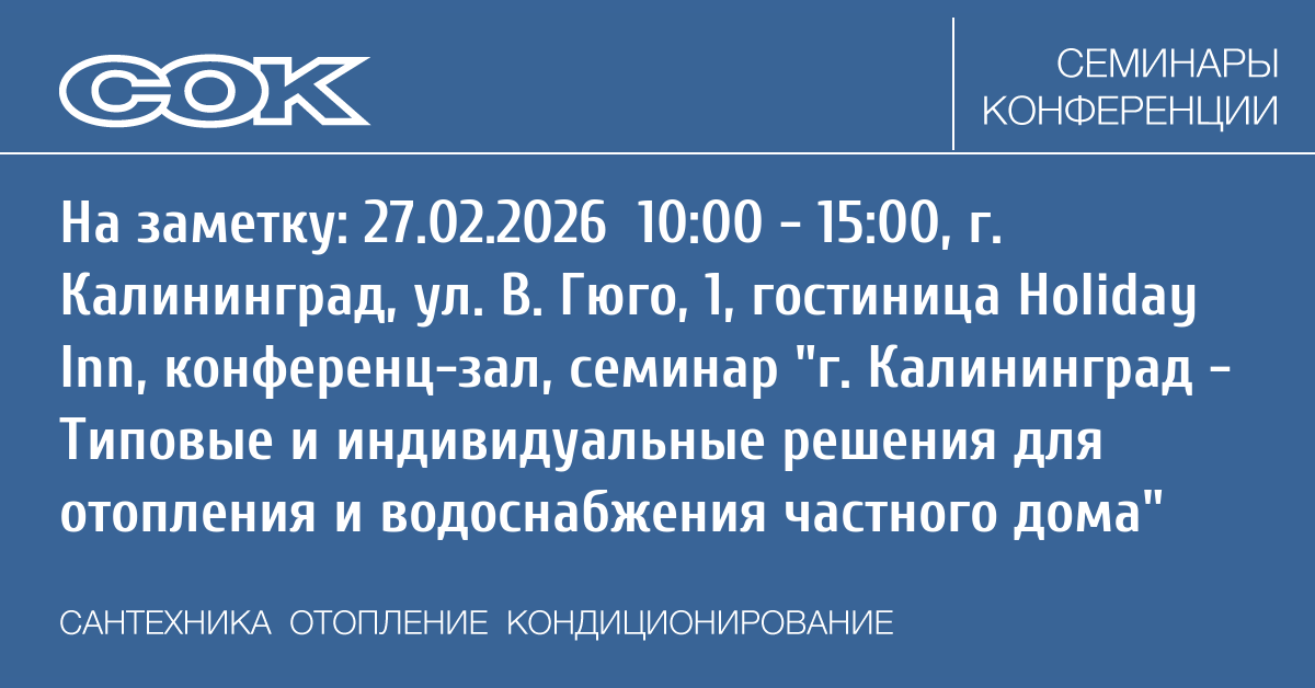 - 27.02.2026 10:00 - 15:00 Семинар г. Калининград - Типовые и индивидуальные решения для отопления и водоснабжения частного дома